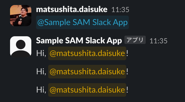 その後変更をビルド・デプロイして、Slack Appにメンションを送ってみます。