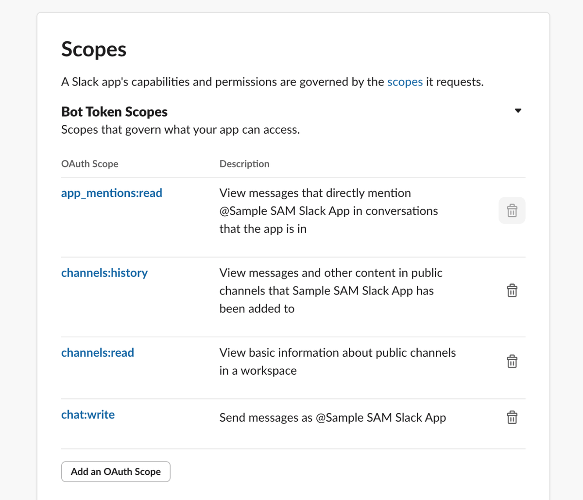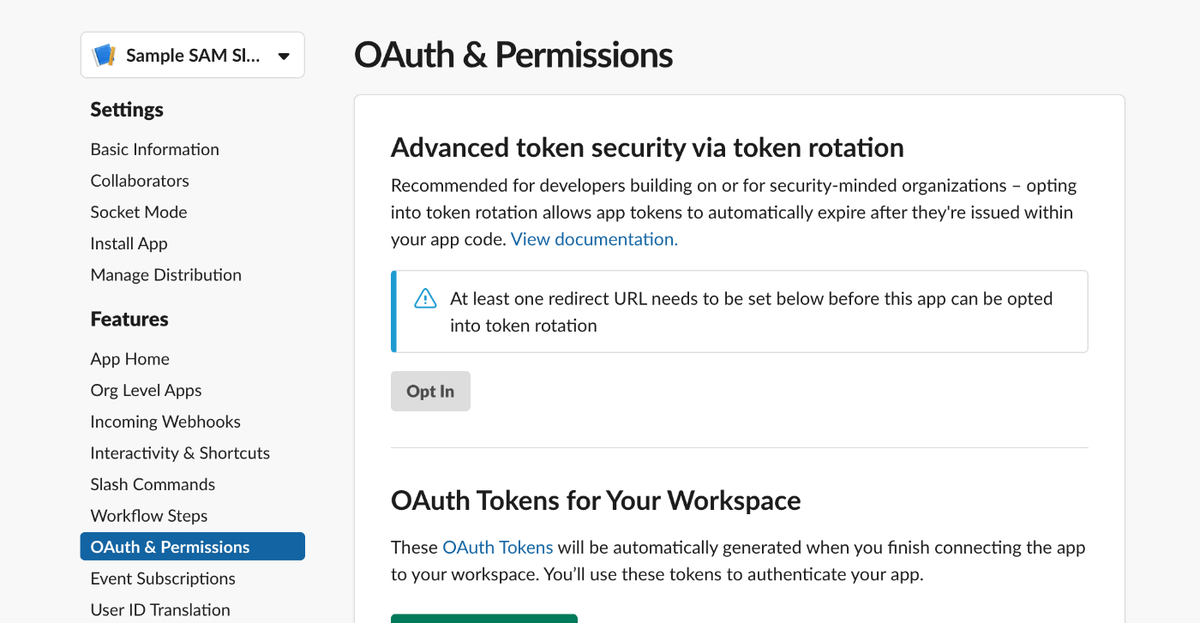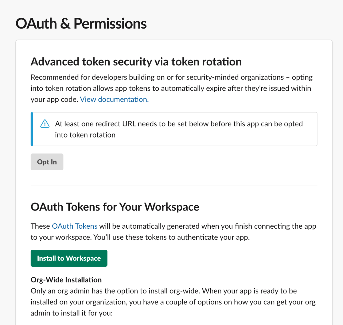 その後、Slack Appの「OAuth & Permissions」を開いてください。