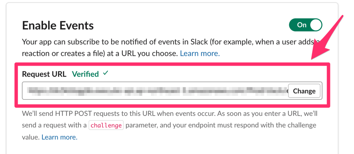 「Request URL」にデプロイ時に出力されたAPI GatewayのURLを、パス(/slack/events)まで含めて入力します。URLを入力した時点で、Slack側からVerifyのリクエストが発行され、うまくいっている場合はVerifiedと表示されます。