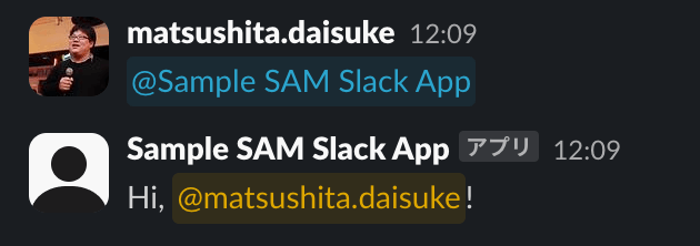 ここまで来ればもうSlack Appは動く状態になっています。任意のSlackチャンネルにSlack Appを追加して、メンションを飛ばしてみましょう。