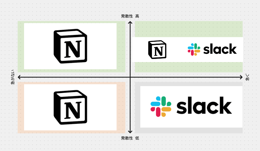 この問題から緊急度と会話の発散性によってNotionに書くだけやNotionに書いたうえでSlackするなど 用途によって使い分けるようにし、その時のルールとして下記の図のように対応することに決めました。