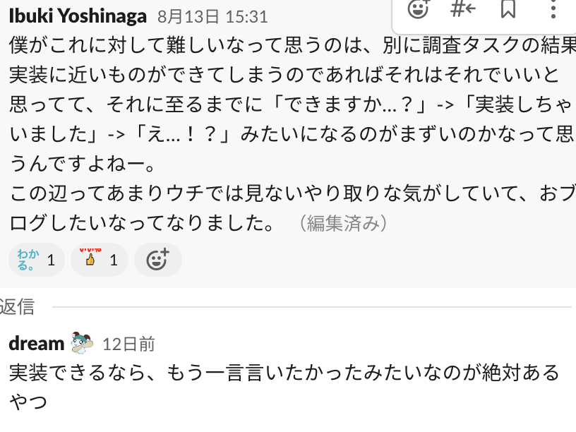なので、上記ツイートに対して私が感じた問題はエンジニアが調査依頼に対して結果的に実装を終えてしまった部分ではなく、実装をしてしまったことに周りが驚いてしまっている、更にそれに対して依頼者が気を遣ってしまう結果になっていることだと感じました。