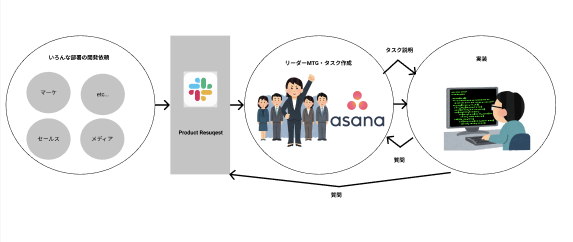他部署からの依頼は、基本的にProduct Requestという名前のSlackチャンネルに投稿され、規模が大きいものは翌日に各チーム(エンジニア、デザイナー、企画)のリーダー陣が揃った会議で揉まれます。