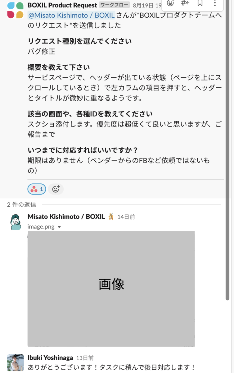 上記の例ではバグ修正になっていますが、依頼に対しての実装可否や、機能追加などの際には「この動作をしたときはこうなって良いですか?」といった質問のやりとりをスレッド上ですることになります。